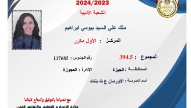 مبارك تعليم الجيزة 🌹❤️ المركز الأول على مستوى الجمهورية فى الشعبة الأدبية 👍 الطالبة ملك على السيد بيومى إبراهيم المركز…