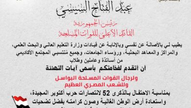 ◾ وزير التعليم العالي ومنتسبو المجتمع الأكاديمي يهنئون الرئيس عبد الفتاح السيسي ورجال القوات المسلحة بالذكرى الـ 52 لانتصارات…